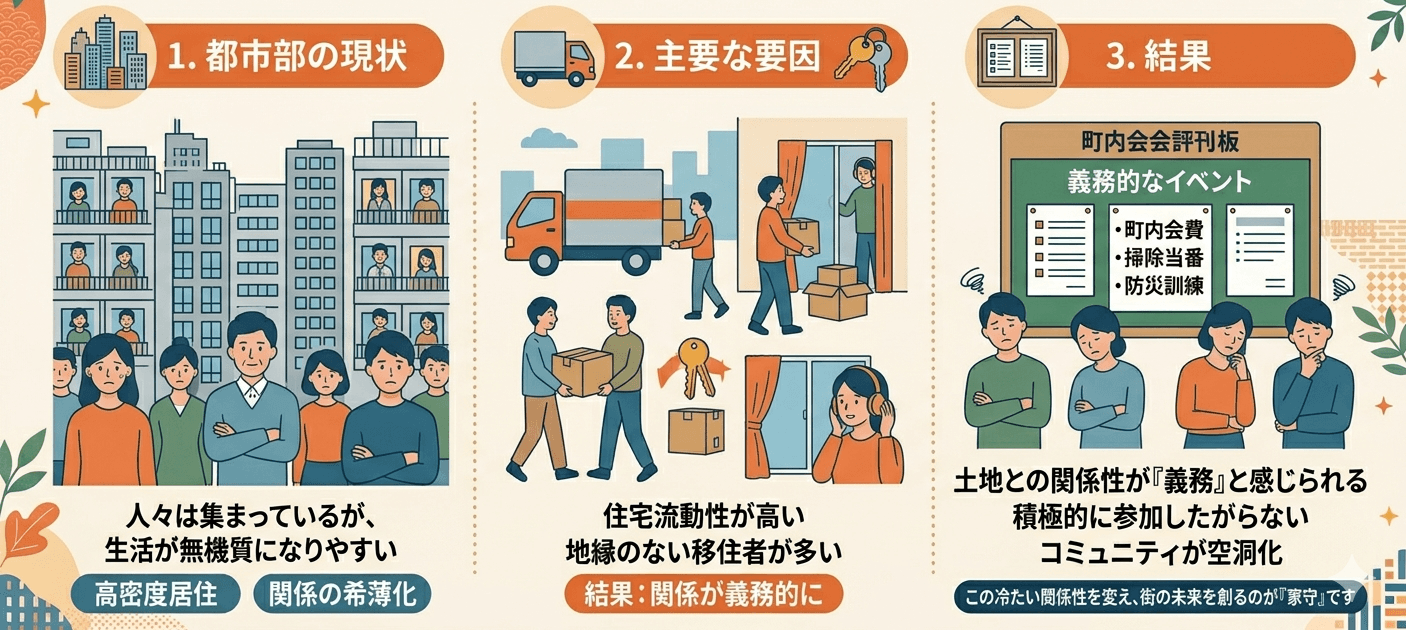 コミュニティに関しては、その土地の関係性を「義務的なもの」と感じられることが多く、人々が積極的に参加したがらないという現状がある。